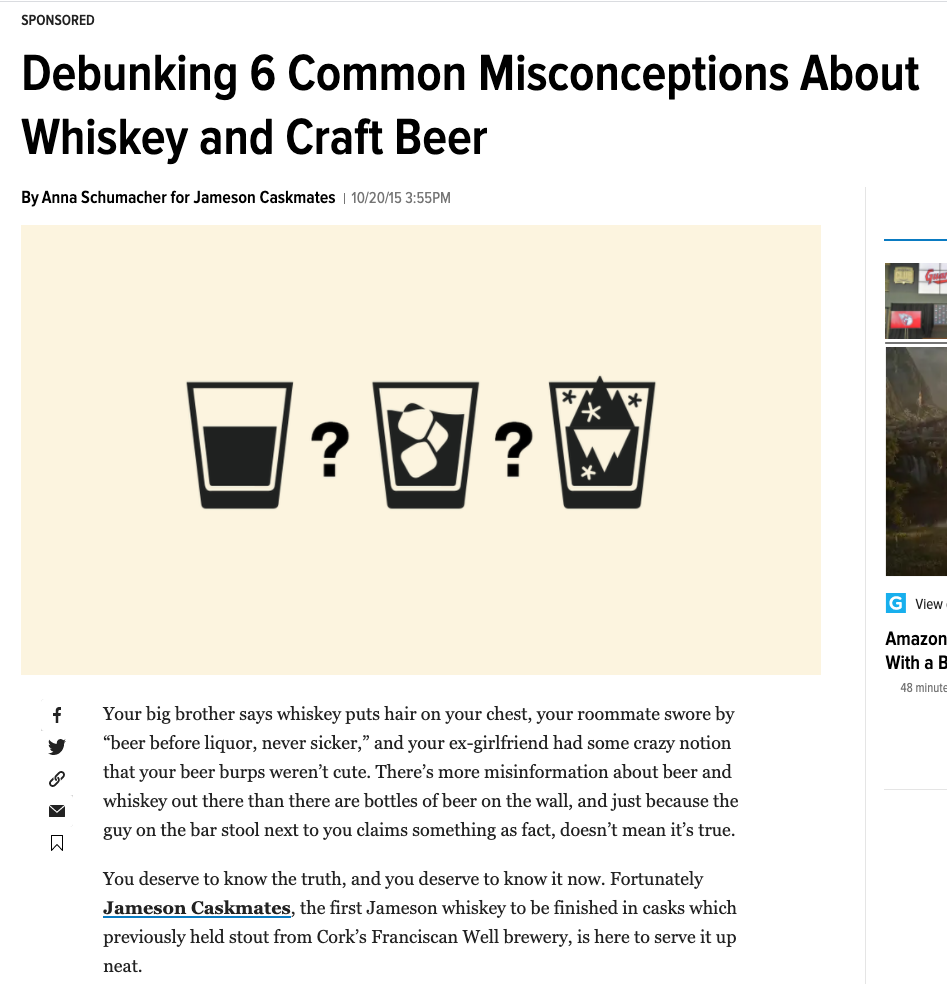 As a freelance content writer for the Gawker Studio I wrote branded articles in the voices of Gawker, Jezebel, Lifehacker, Gizmodo, Deadspin, and Jalopnik. My co-branded piece for Jameson debunking common myths about beer and whiskey broke Gawker’s record for sponsored content with over 100,000 views in its first month.