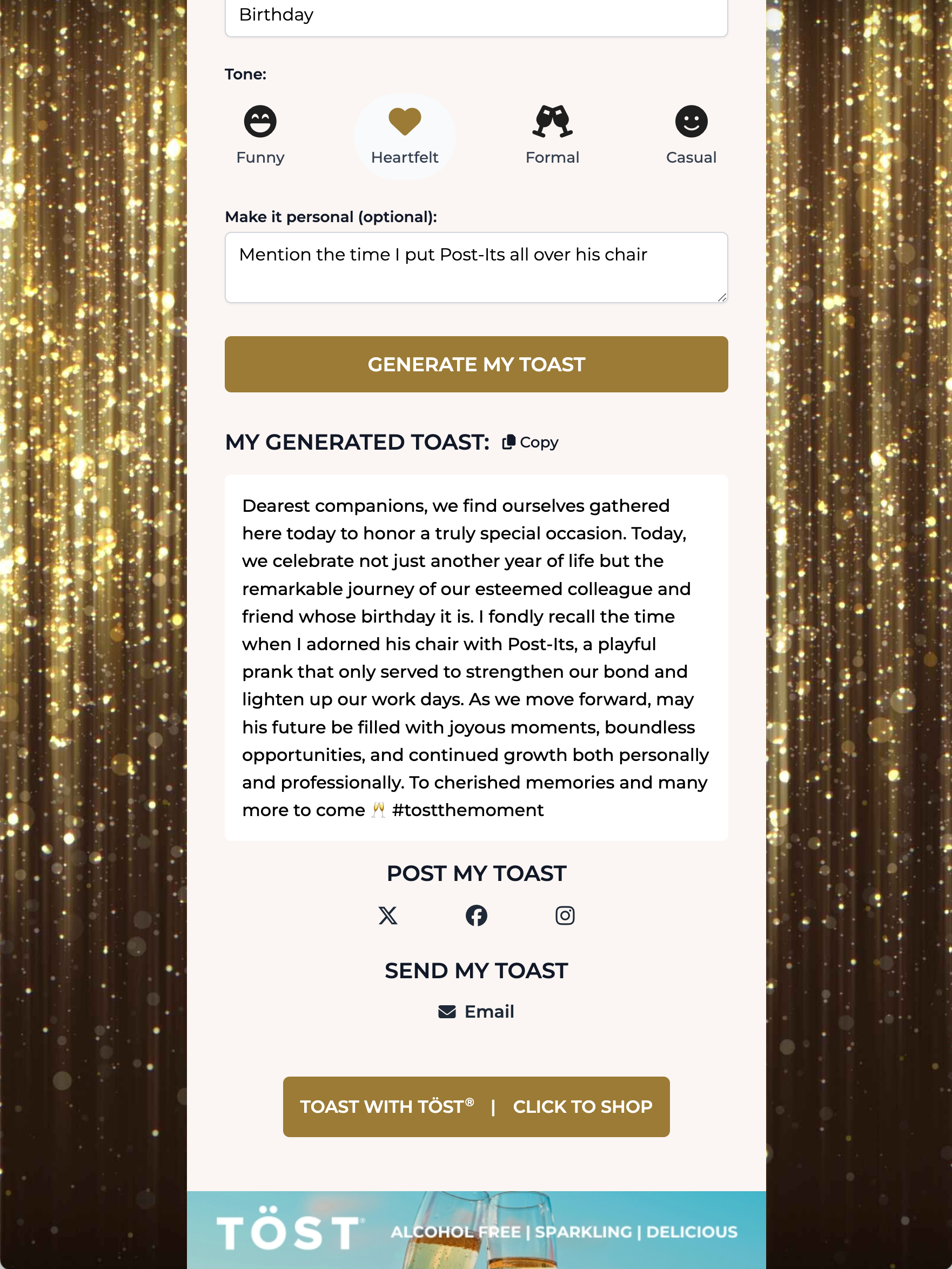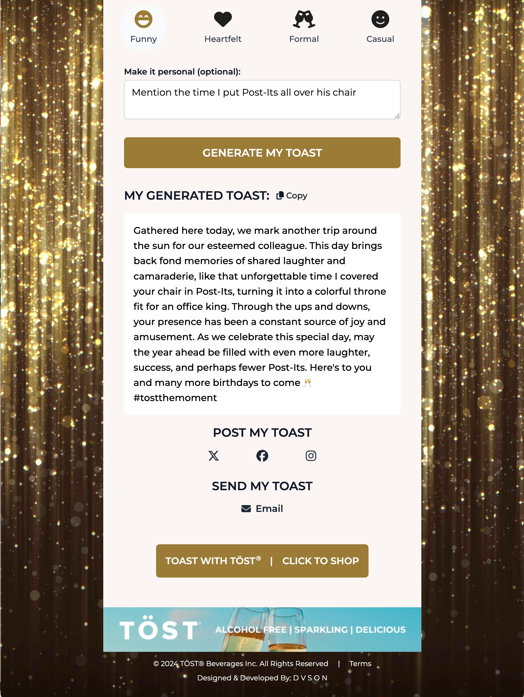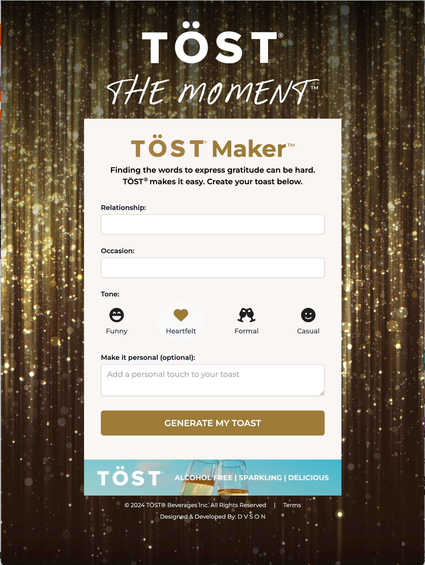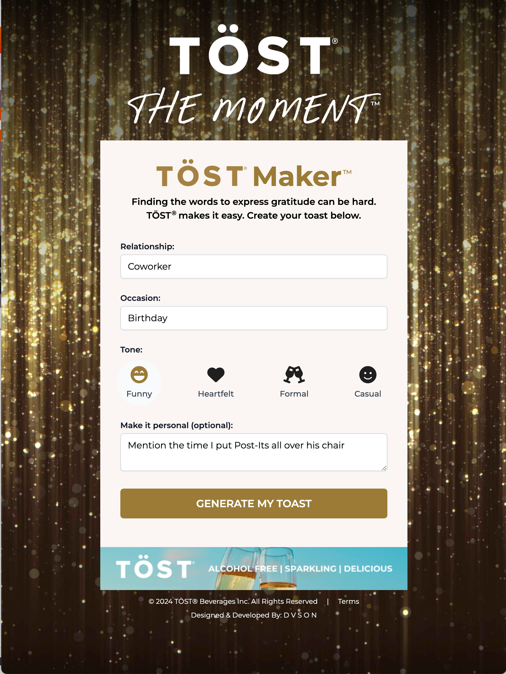 To help position TÖST as a premium non-alcoholic party beverage, I came up with the concept of an AI-powered toast generator to help users find the perfect words for any celebratory occasion.