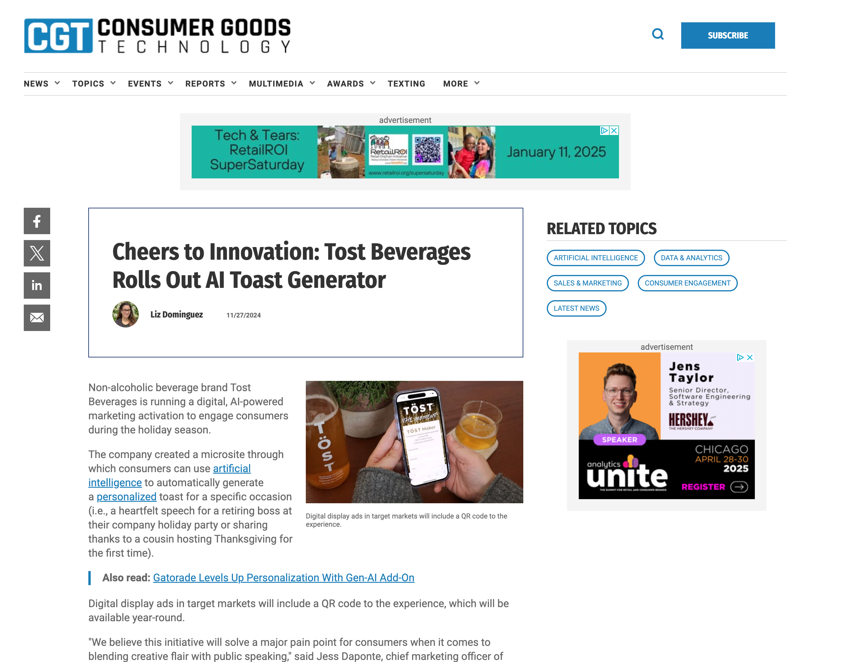 Since going live, the Töst Maker has received press from CAMPAIGN and Consumer Goods Technology, which used it as the lead example in an article about beverage brands innovating with AI.
